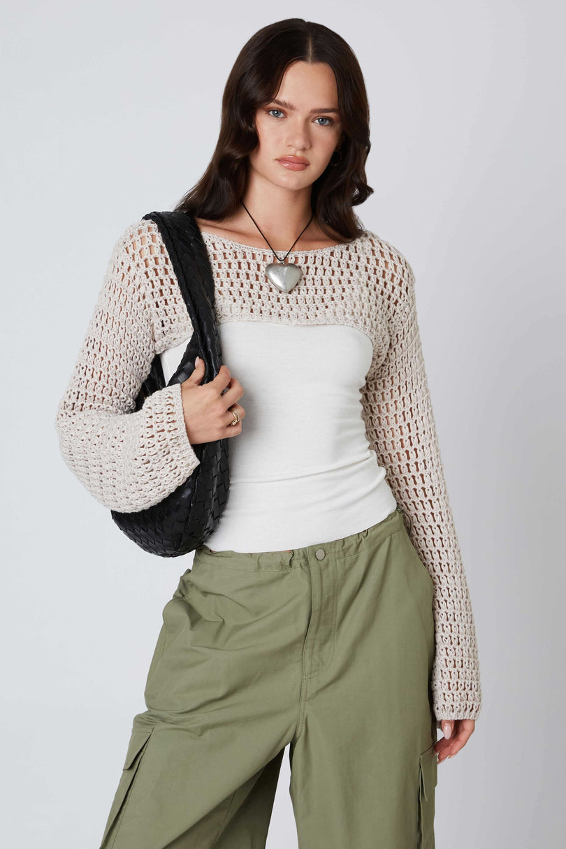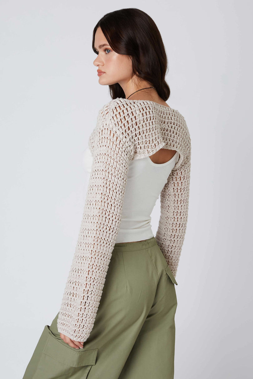 The Savannah Stone Crochet Shrug is a cute little sweater that will update any look! Stone crochet knit forms a boat neckline that can be worn on or off the shoulder, and long wide sleeves. Style over a tube top or dress for a cute updated look!