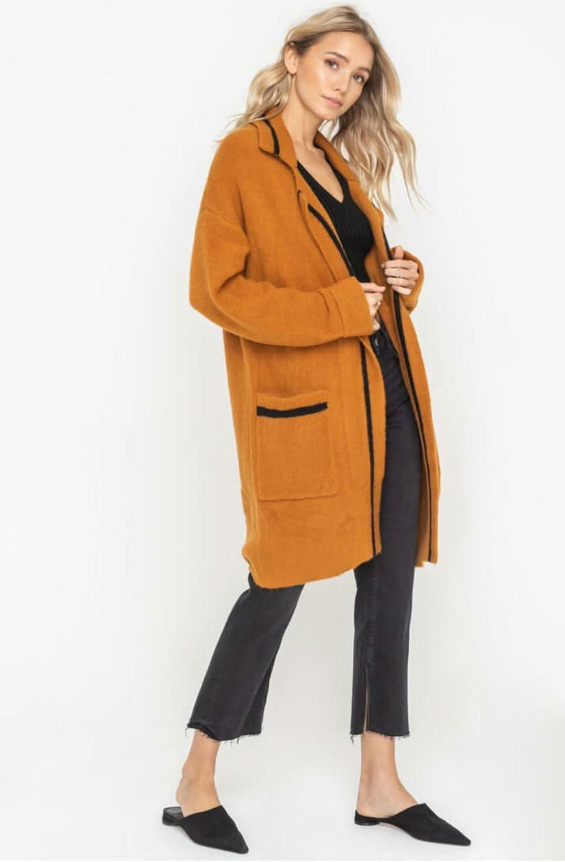 Cozy up in the LUSH Fleet Street Camel Cardigan Sweater this season! Warm camel knit, with black stripe trim, forms the chic cardigan with a collared neckline, wide lapels, long cuffed sleeves, and long, open bodice with patch pockets.