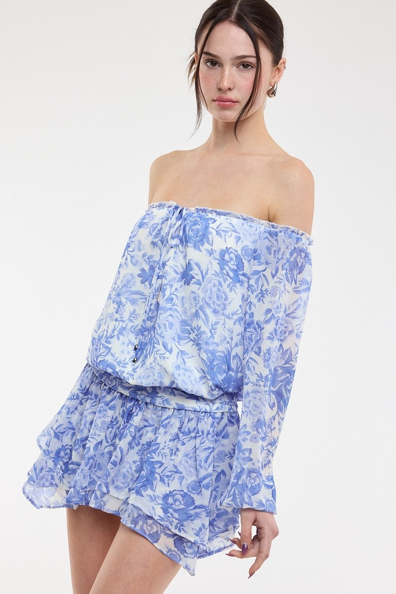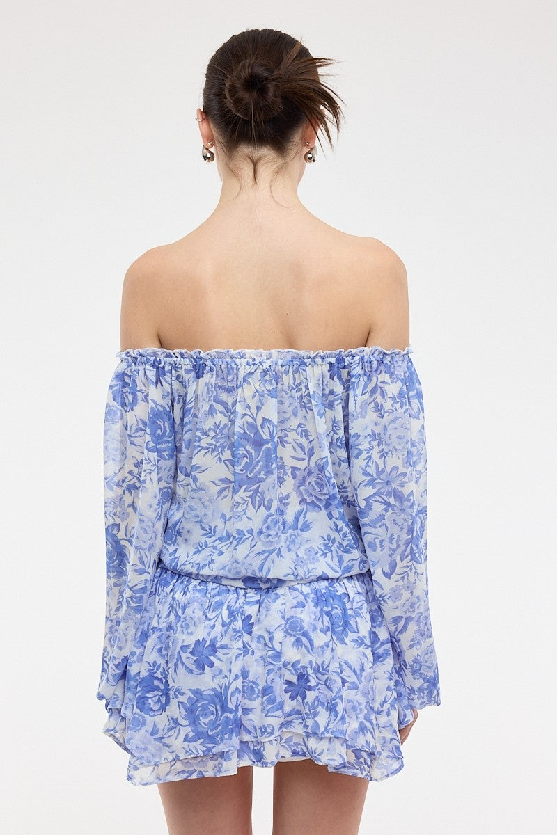Blue Floral Off The Shoulder Romper Dress