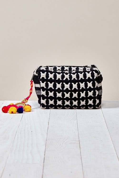 The Hannah Black Geo Print Makeup Bag will be your new go-to travel bag! Black and natural yarn in a tone-on-tone geo pattern shapes this origami makeup bag with a colorful pom-pom zipper. Lined.