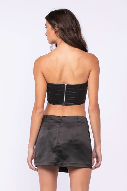 Chic Two-Piece: A matching corset crop top and mini skirt create a semi-formal outfit.