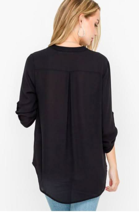 The See That Girl Black Roll Tab Sleeve Top is ready for sunny days and walks in the park! This lightweight flowy tunic top top pairs a silky woven material with button-tab quarter sleeves, a split, deep V-neckline, and a rounded high-low hemline.